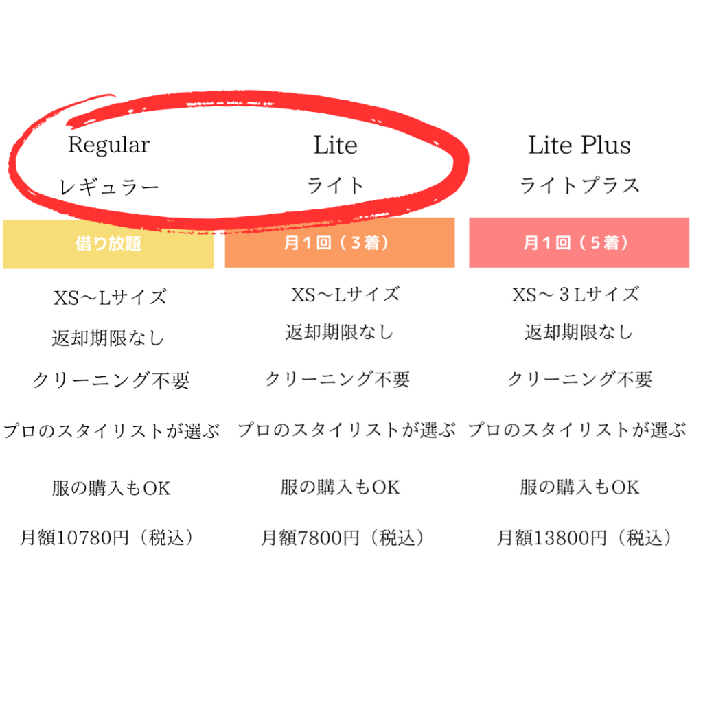 そして、レギュラープラン(借り放題)、ライトプラン(月1回3着)のプランを利用していると無料で服を選ぶことができます。