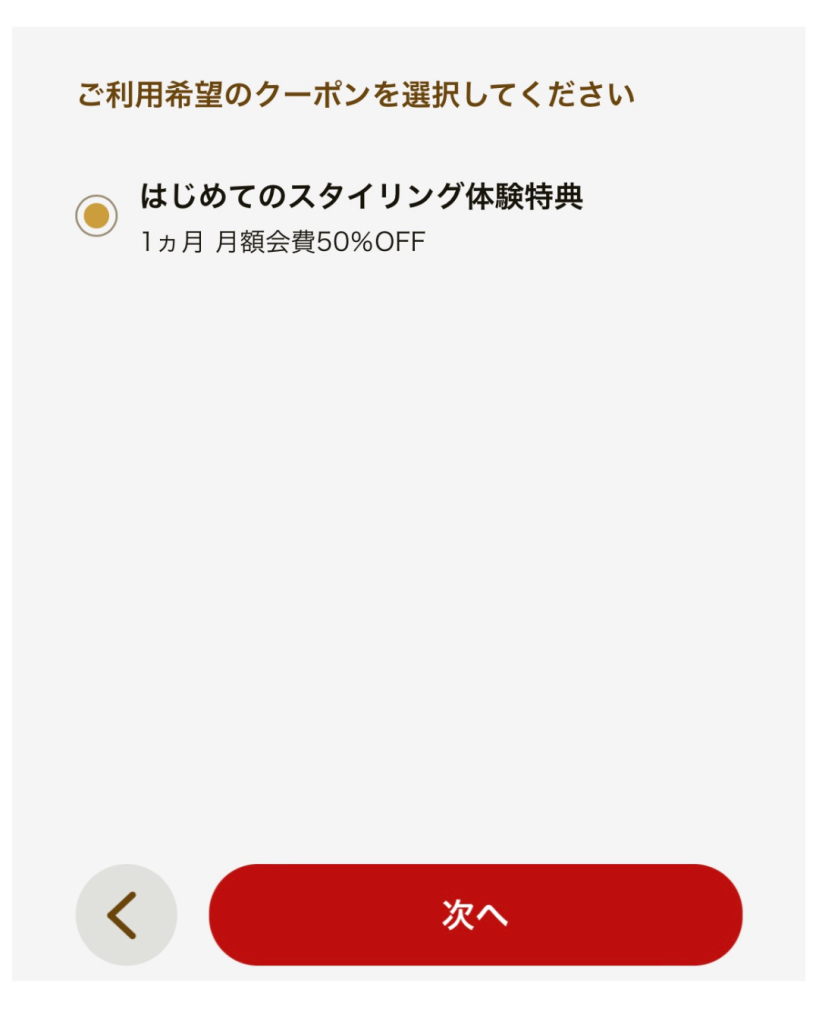 会員登録を進めると表示される、「始めてのスタイリング体験特典」から、全てのプランを初月50%オフで始めることができます。