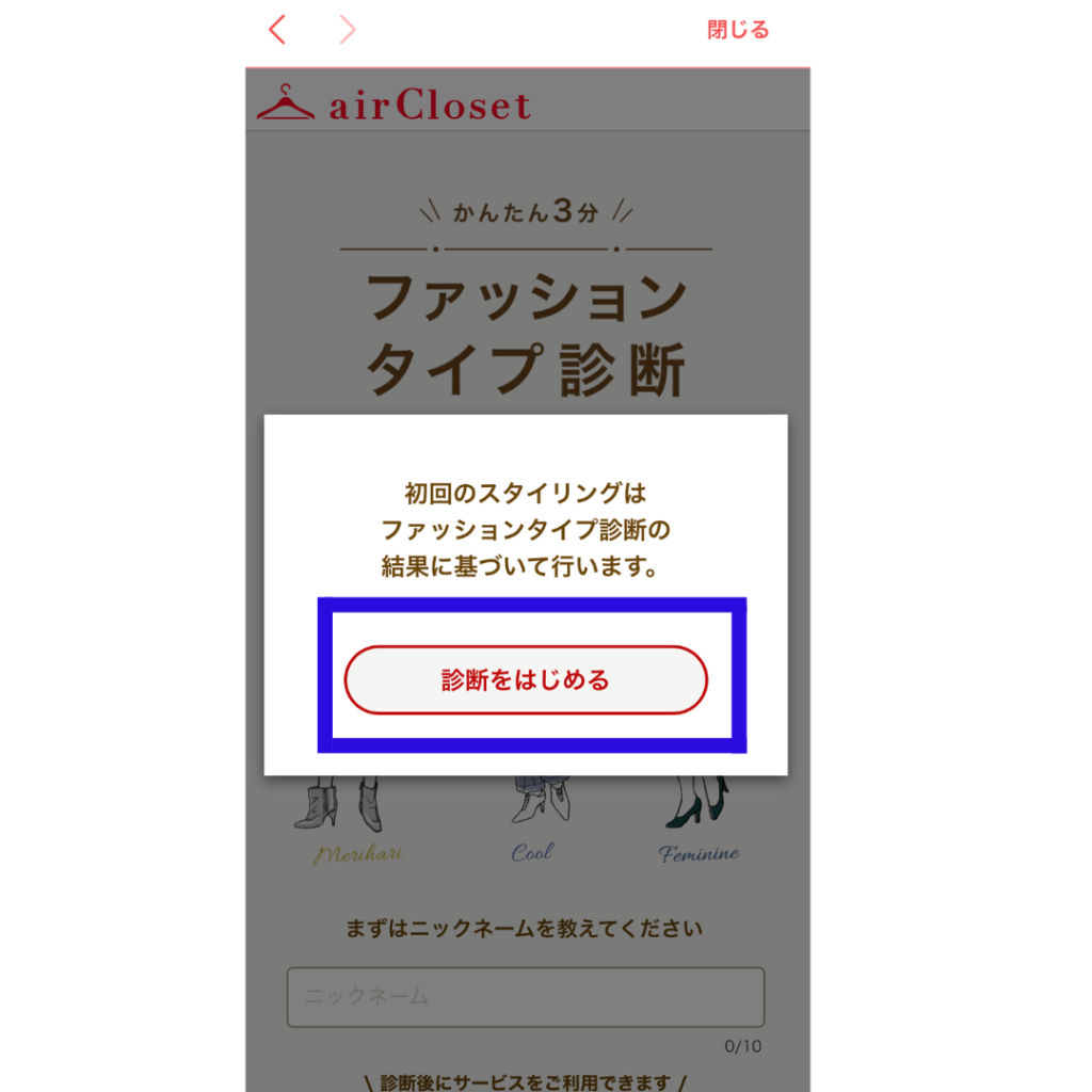 エアークローゼットを再開する時には、「air Closetから始める」からできます。