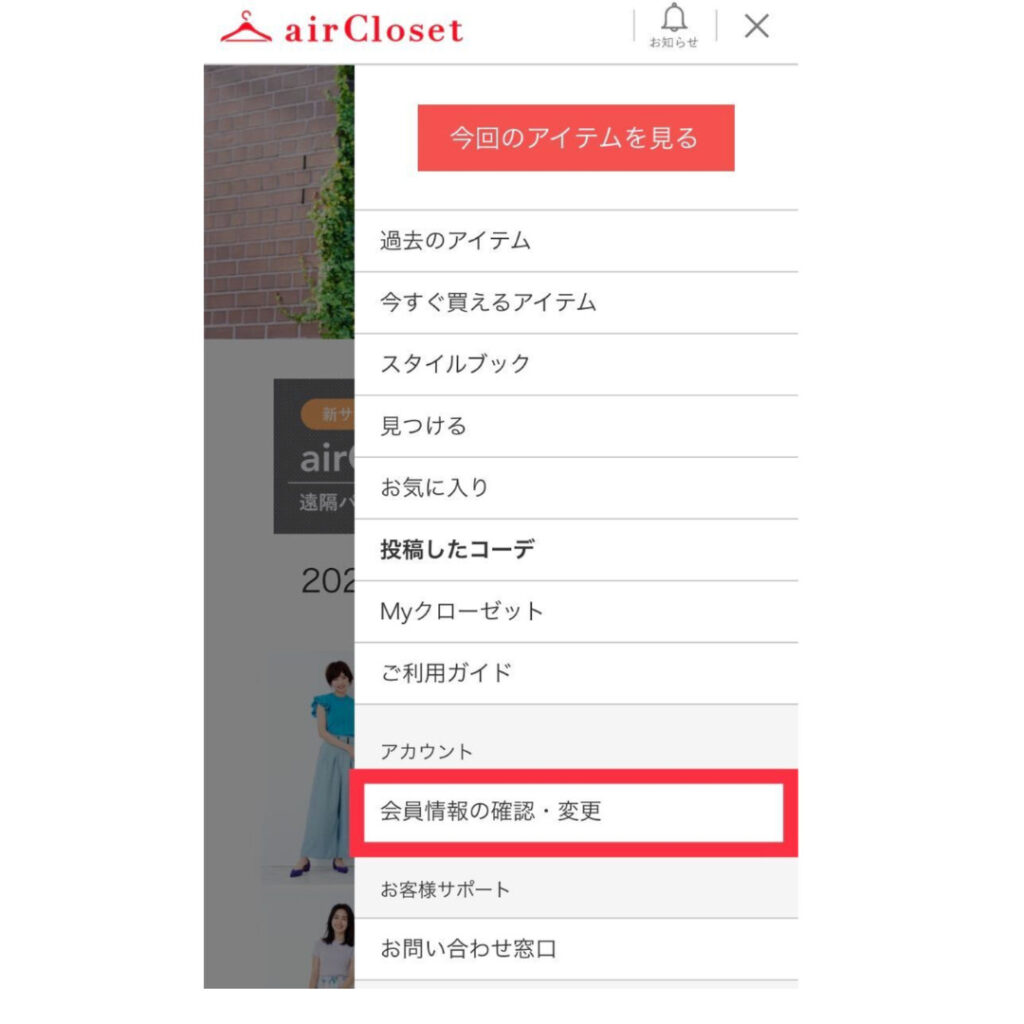 再開する時は、「air Closetを始める」から進むと月額会員になり服を借りれます。