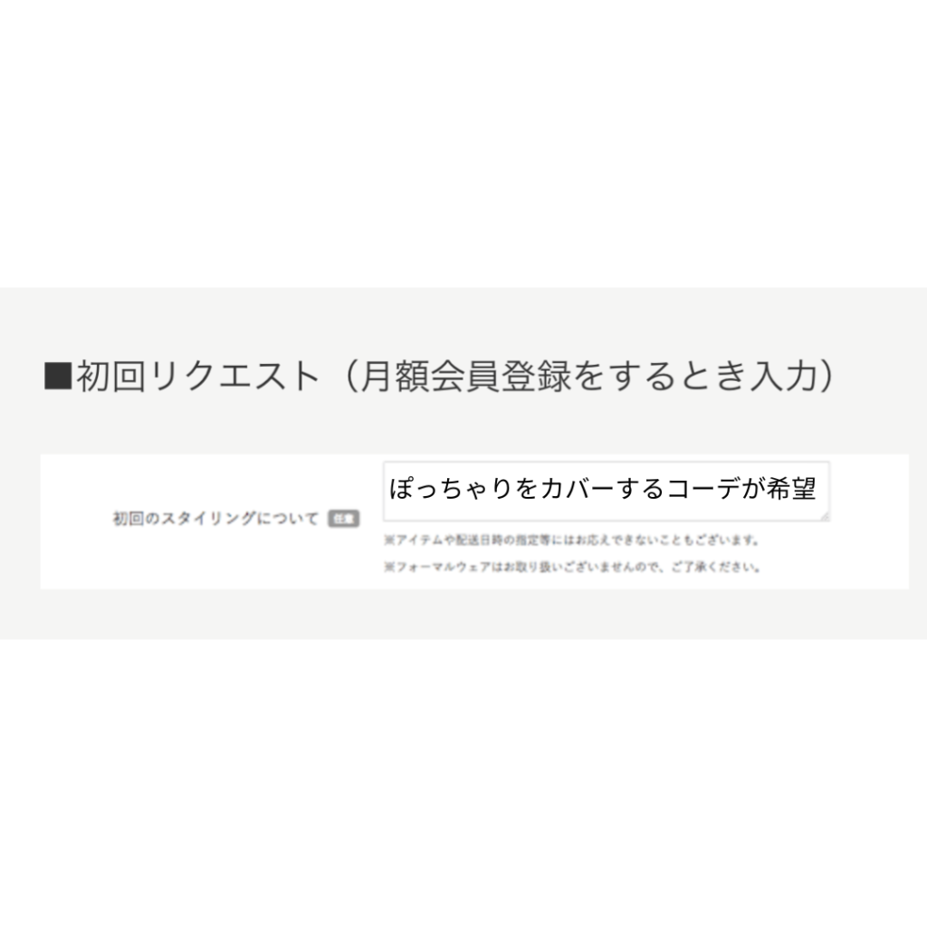 というように、自分の悩みをスタイリストに伝えることで、似合うコーデが届くようになります。