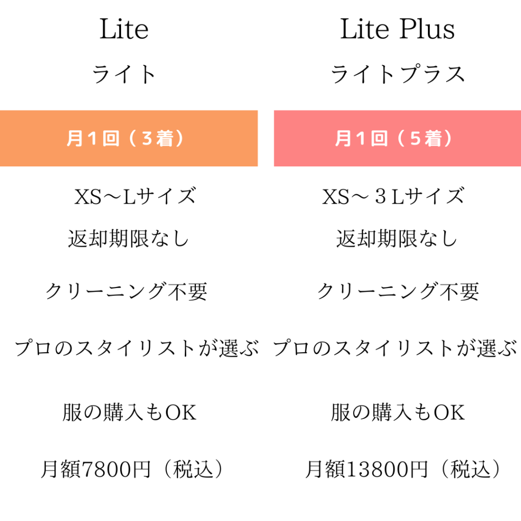 レギュラープラン(借り放題)は、10800円でライトプランは月に1回3着で7800円(税込)です。