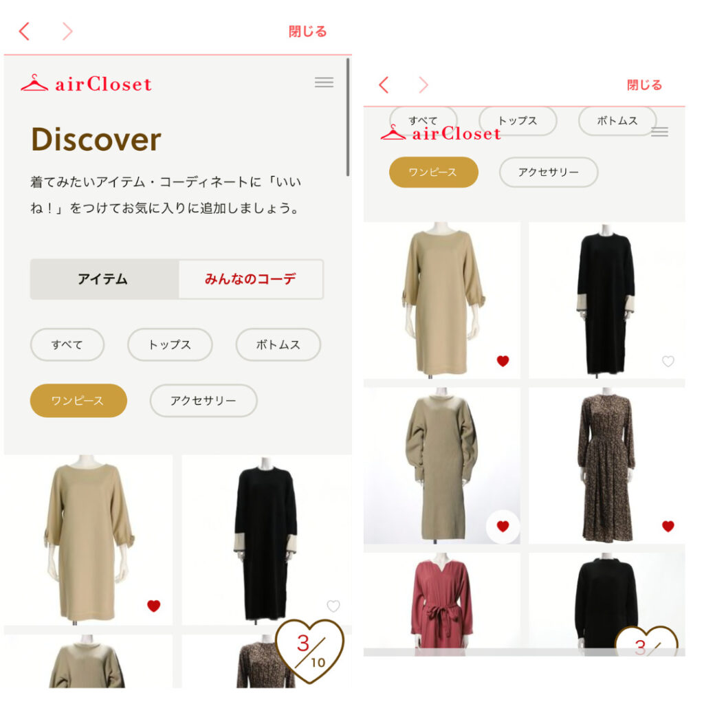 その他には、「見つける」と言って、自分の好きな服にハートマークを10個つけることができます。