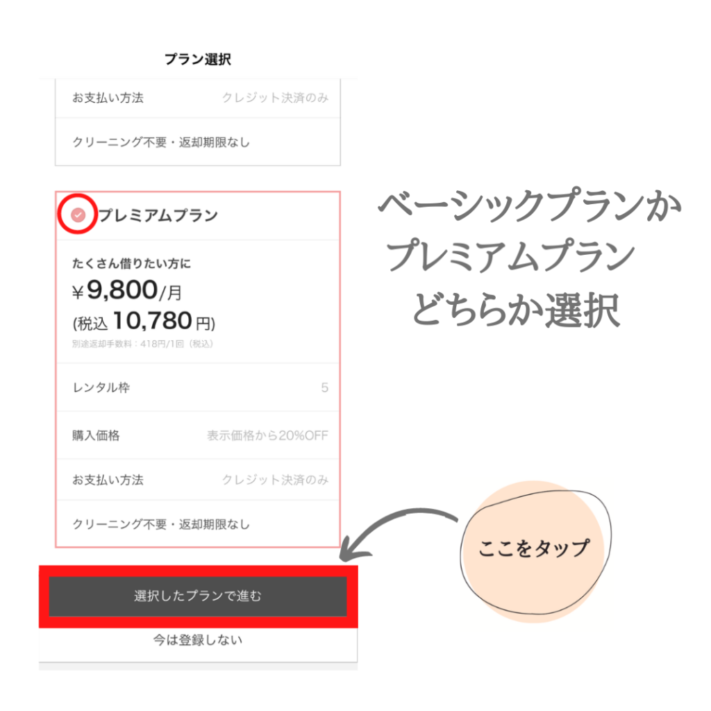 メチャカリは、3つのプランを選んで月額で服を借ります。