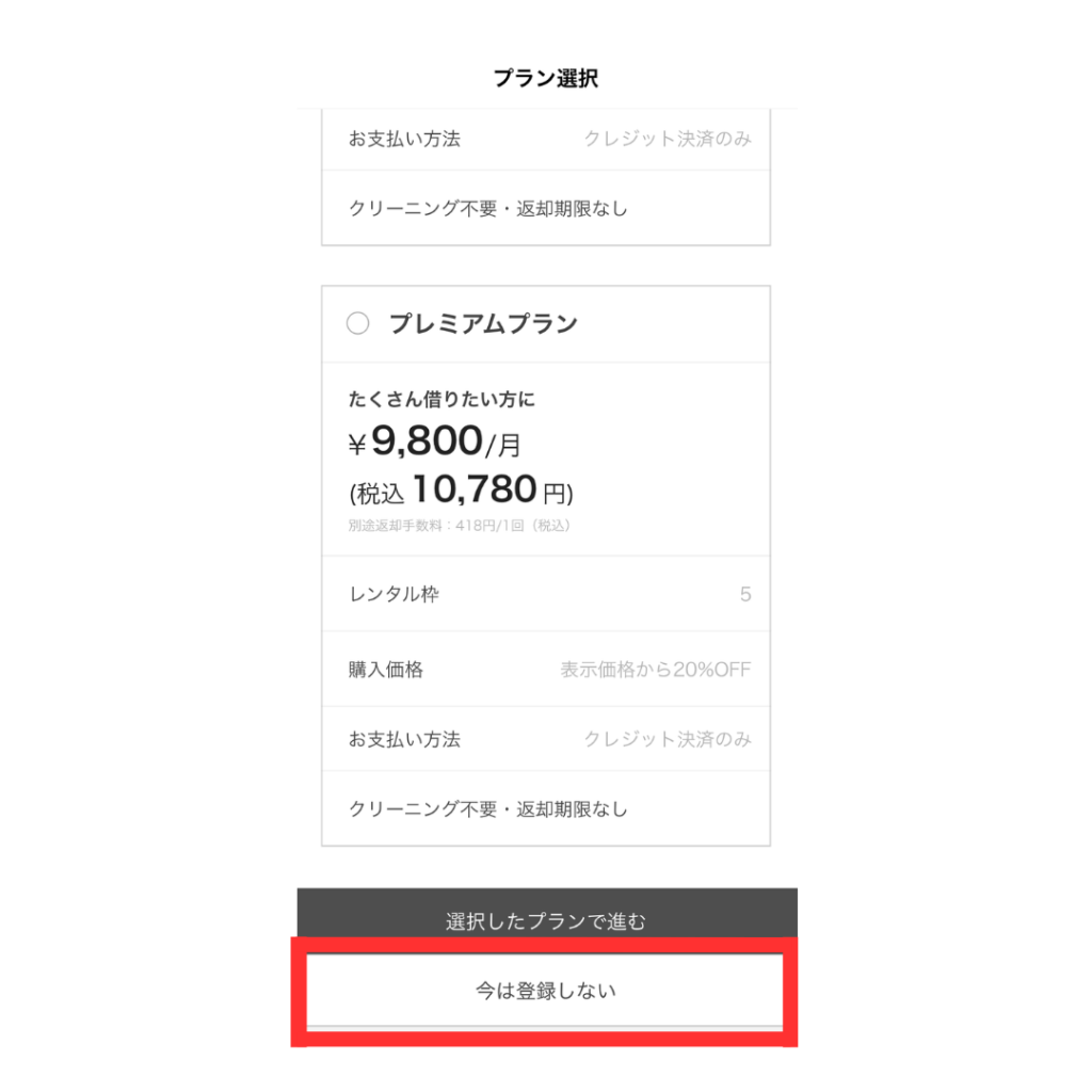 6. プランを選択する画面になりので「今は登録しない」を選んで無料会員登録の完了です。