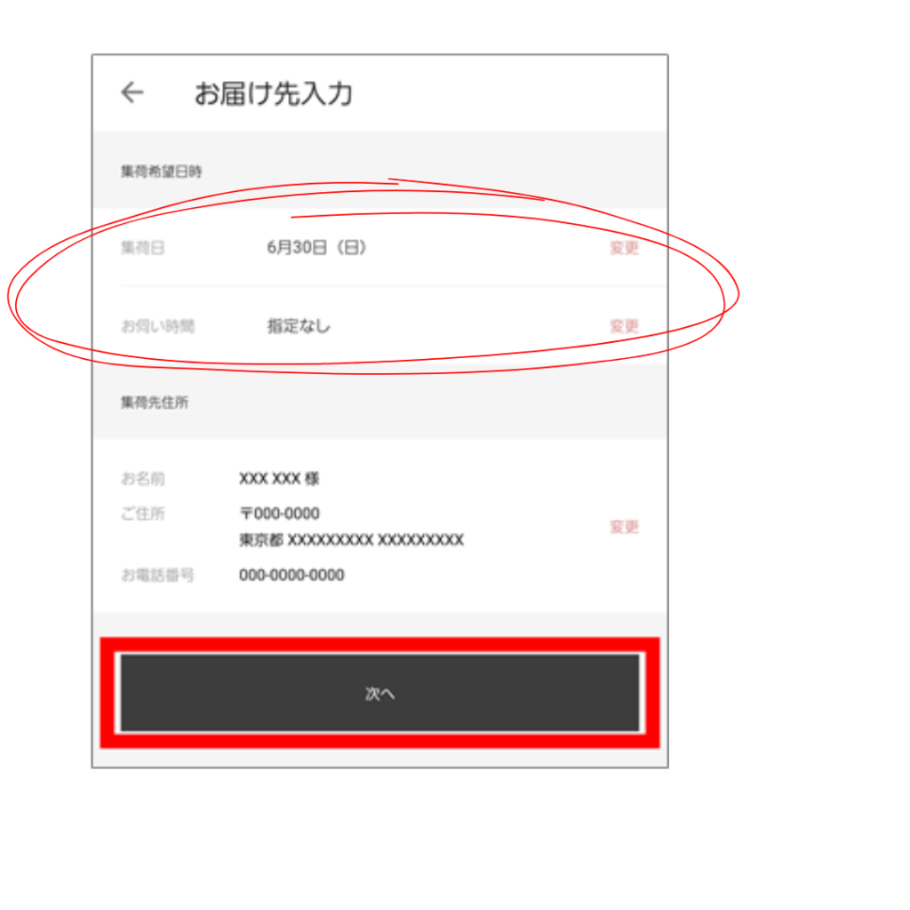 次の画面で、集荷をする、希望の日、時間を決めることができます。