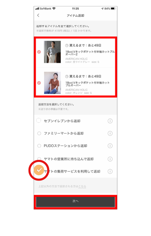 次に、「ヤマトの集荷サービスを利用して返却」にチェックを入れましょう。